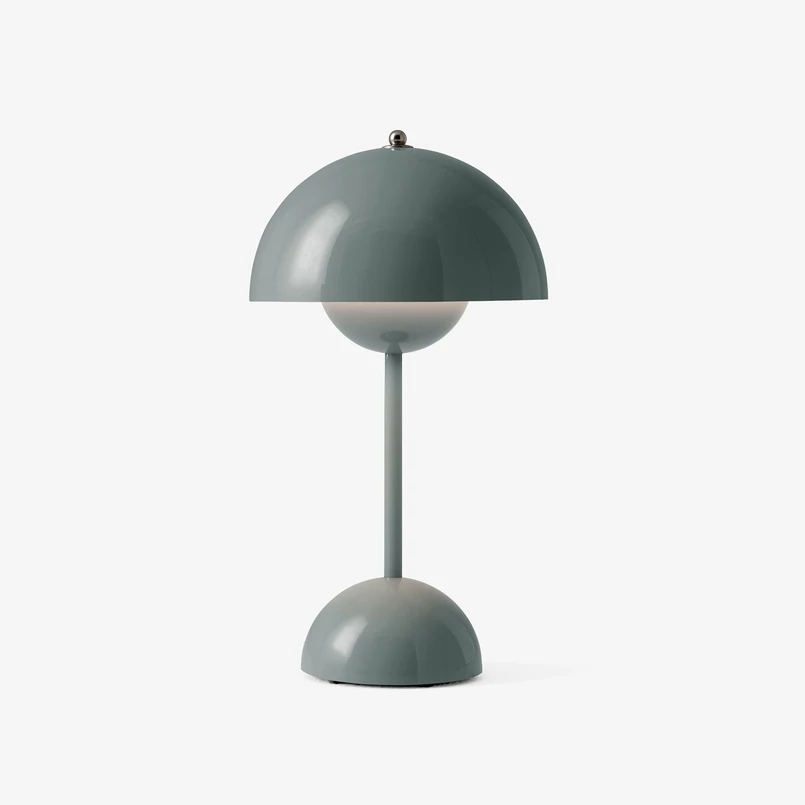 Flowerpot VP9 LED-batteridrevet bordlampe i stenblå fra &tradition er en moderne version af Verner Pantons ikoniske design fra 1968. Lampen er transportabel og kan bruges både indendørs og udendørs i beskyttede områder. Lysstyrken kan justeres i tre trin via touchdimmer. Den er vandtæt med IP44-beskyttelse.